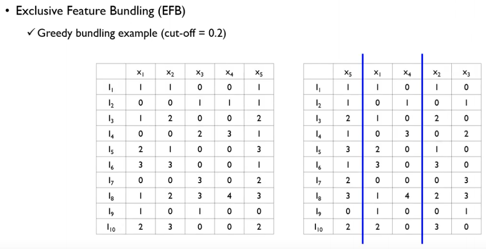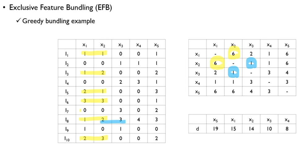 EFB ( Exclusive Feature Bungdling) > 모든 feature들에 대해서 수행하지 않기 위한 방법