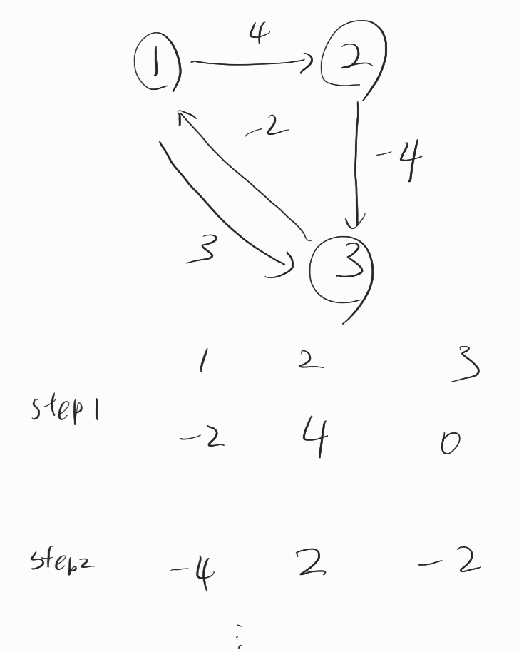 위와같은 그래프는 진행하면 할 수록, 1,2,3의 최단거리가 점점 줄어드는 것을 알 수 있을 것이다. 바로 '음의 폐로' 때문...