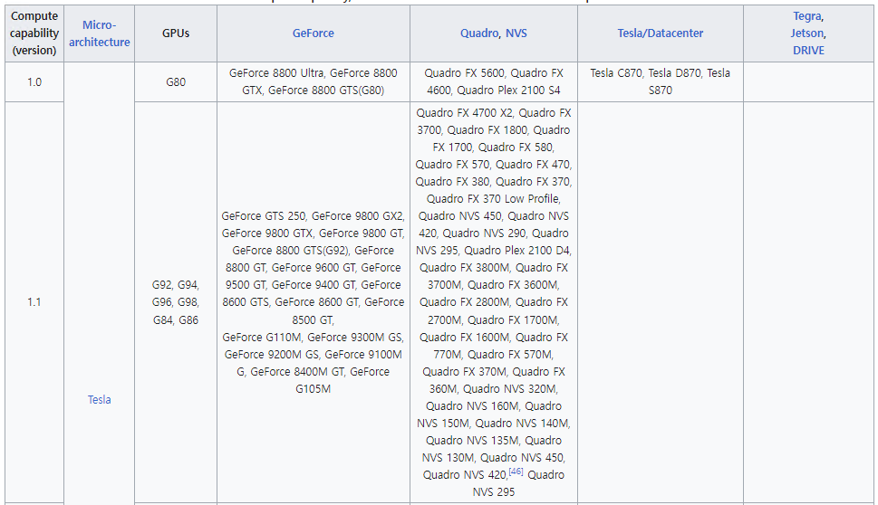 wikipedia 링크에서 "Compute Capability, GPU semiconductors and Nvidia GPU board products" 테이블을 보면,