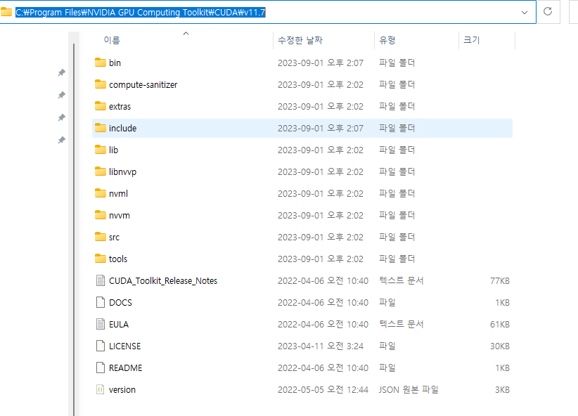 3개의 폴더를 " C:\Program Files\NVIDIA GPU Computing Toolkit\CUDA\v11.7 " 폴더에 넣어서 덮어씌워주면 끝이다.