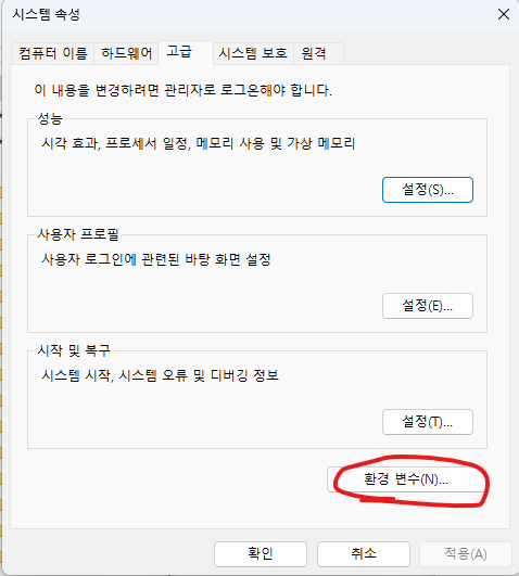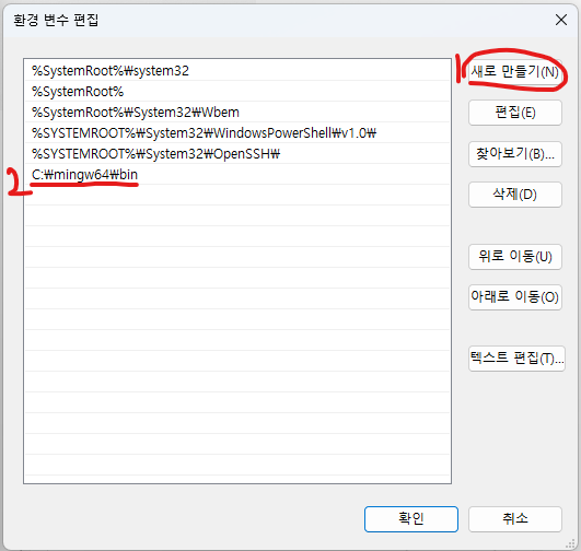 시스템 환경변수 편집으로 들어가 시스템 변수 Path에서 새로만들기로 자신의 mingw64/bin의 위치를 설정해주면 된다.