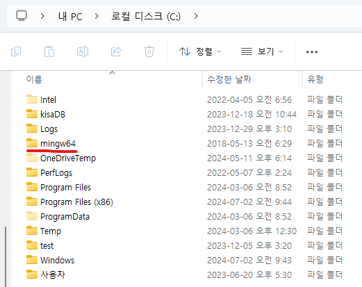 압축파일을 풀면 위와같이 mingw64 폴더가 C드라이브에 있는 것을 볼 수 있을 것이다.