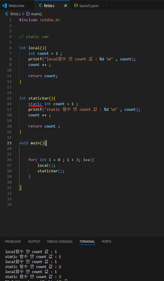 반면에 staticVar의 count는 static 변수이기때문에 위에서 말했던 것처럼, 전역변수처럼 한번만 초기화 되는 것이다.