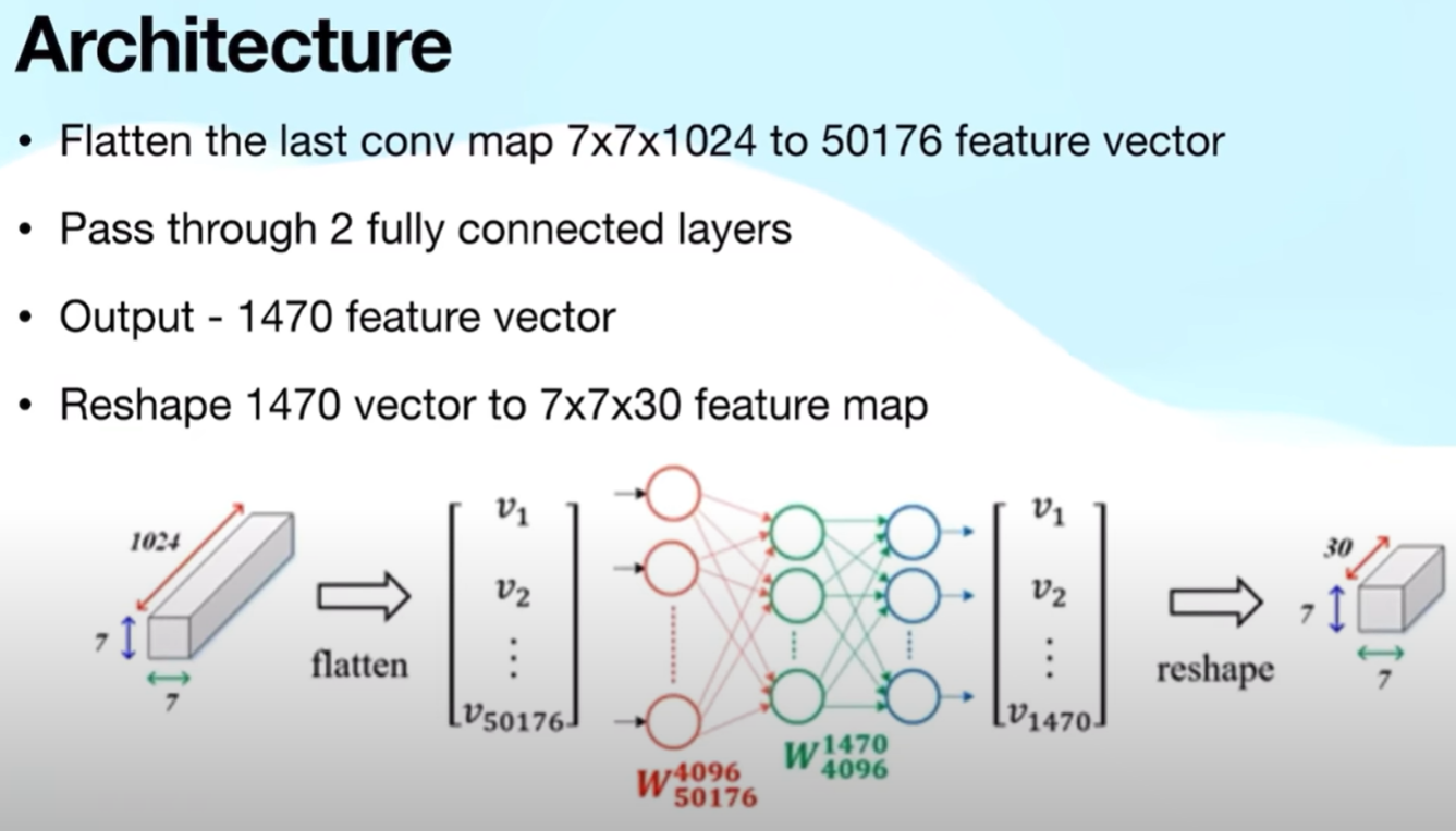 모델의 아키텍쳐같은 경우, GoogleNet에서 영감을 받아, Conv layer와 pooling layer을 사용하여 위와같이 7x7x1024 ->flatten -> 1047 -> 7 * 7 *30의 형태로 바꿔준다고 한다. ( 아키텍쳐같은 경우 어려운 개념이 없다 )