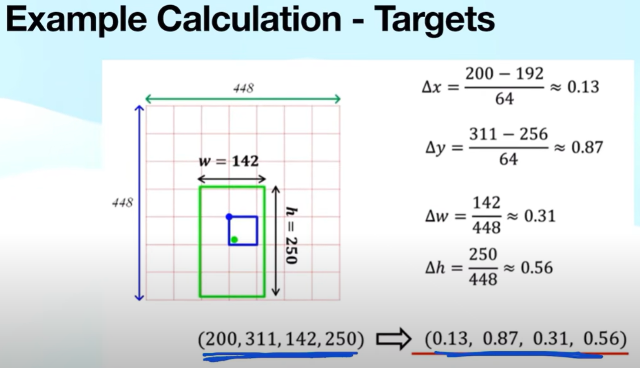 위처럼, 초록색의 점의 좌표를 Bbox로 표현하여 target으로 사용하게 된다. 초록색 점( 객체의 중점 )을 포함하는 cell에서 target을 위와같이 만들게 된다.