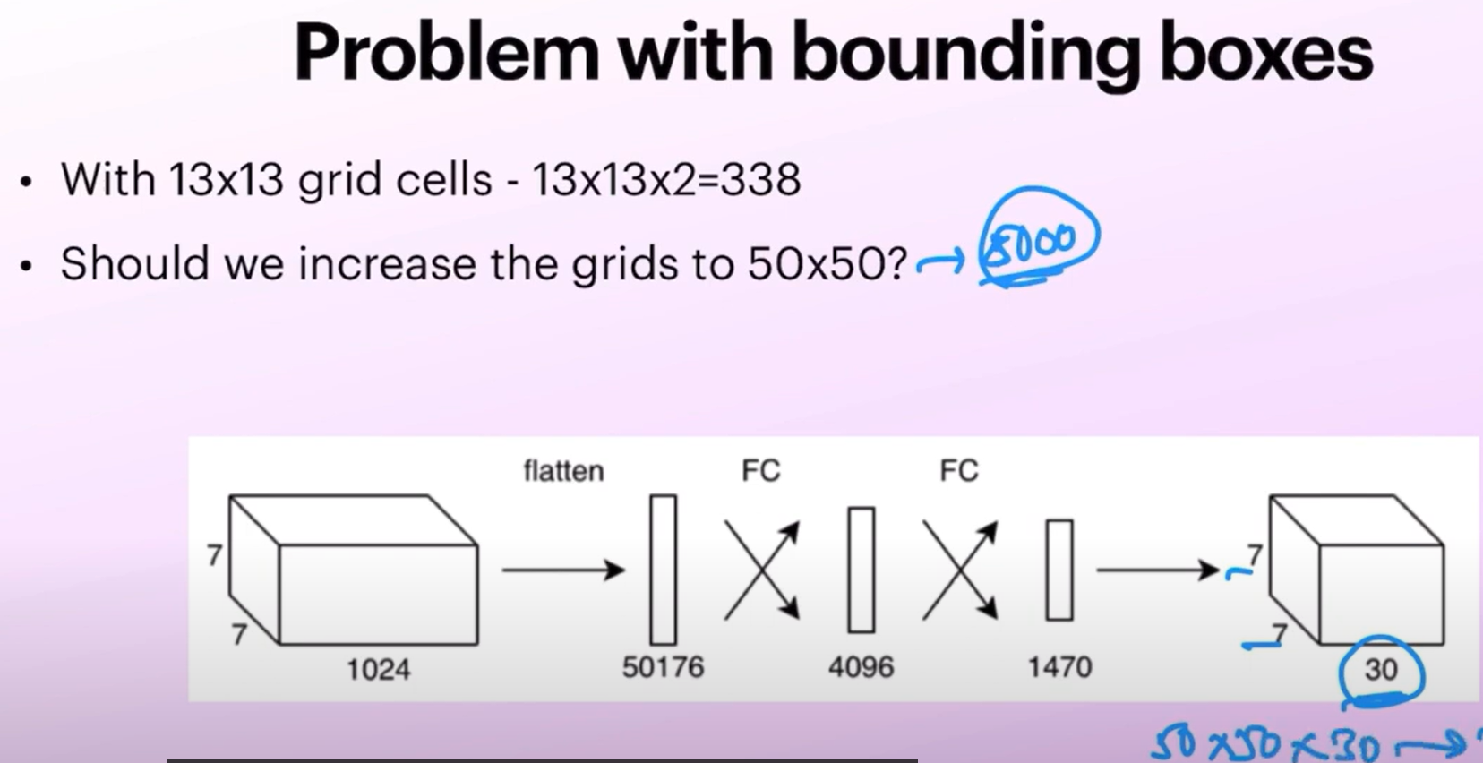13x13 으로 grid cell로 설정을 하더라도 총 169개 object만 탐지가 가능한 단점이 있고, 여전히 object간 겹쳐있을때 중점이 하나의 cell에 있을 수 있다는 단점이 존재한다.