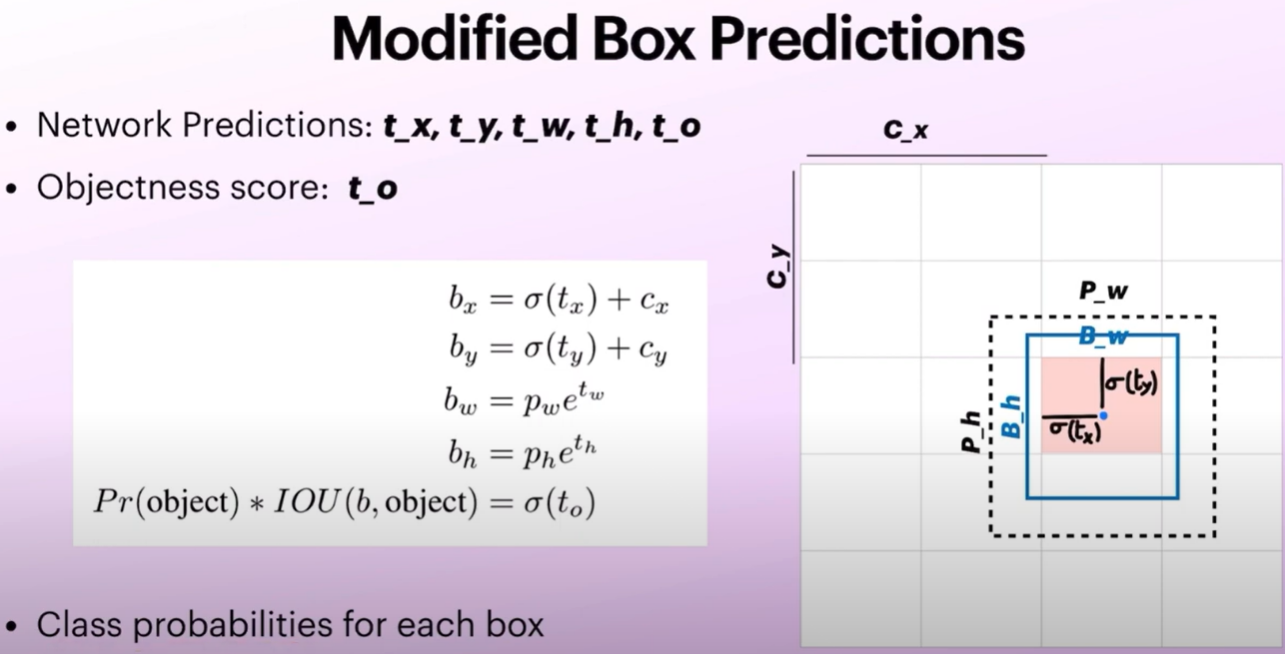 YOLOv2의 예측값을 구하는 공식은 위와 같다. b는 예측하는 Box을 의미한다. 추가로 object Score는 v1과는 다르게 IOU를 추가적으로 이용하여 구하게 된다.