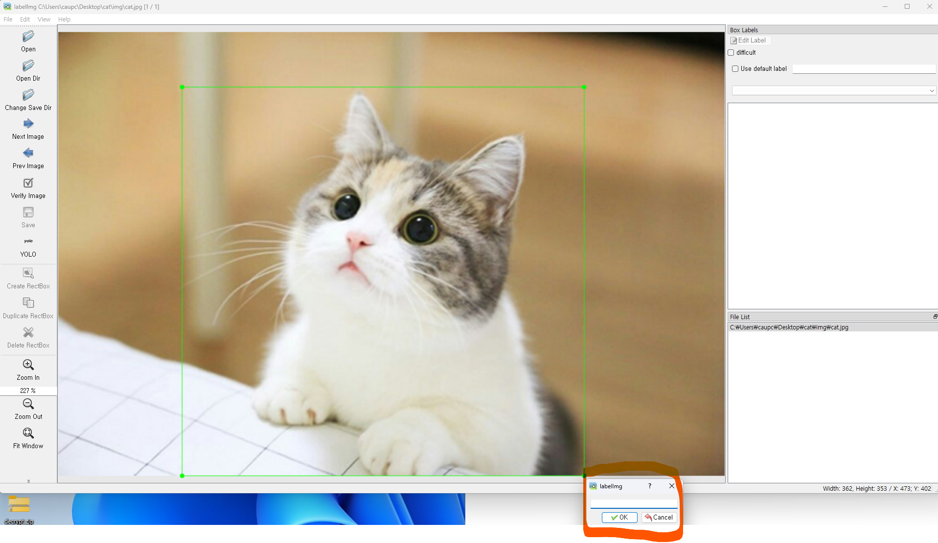 여기서는 cat만 라벨링 하면 되기때문에 cat을 넣어 ok를 해준다.