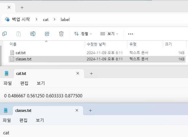 라벨링이 저장되는 폴더를 살펴보면 cat.txt 와 classes.txt가 생성된 것을 볼 수 있고, 각 파일은 아래와 같은 내용을 가지고있다.