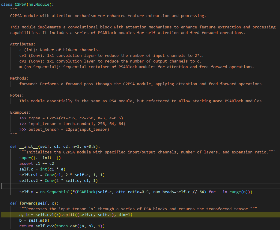 위는 실제 C2PSA 코드이다. 어텐션 메커니즘을 사용하여 피쳐 추출과 처리를 향상시켰다고 한다.