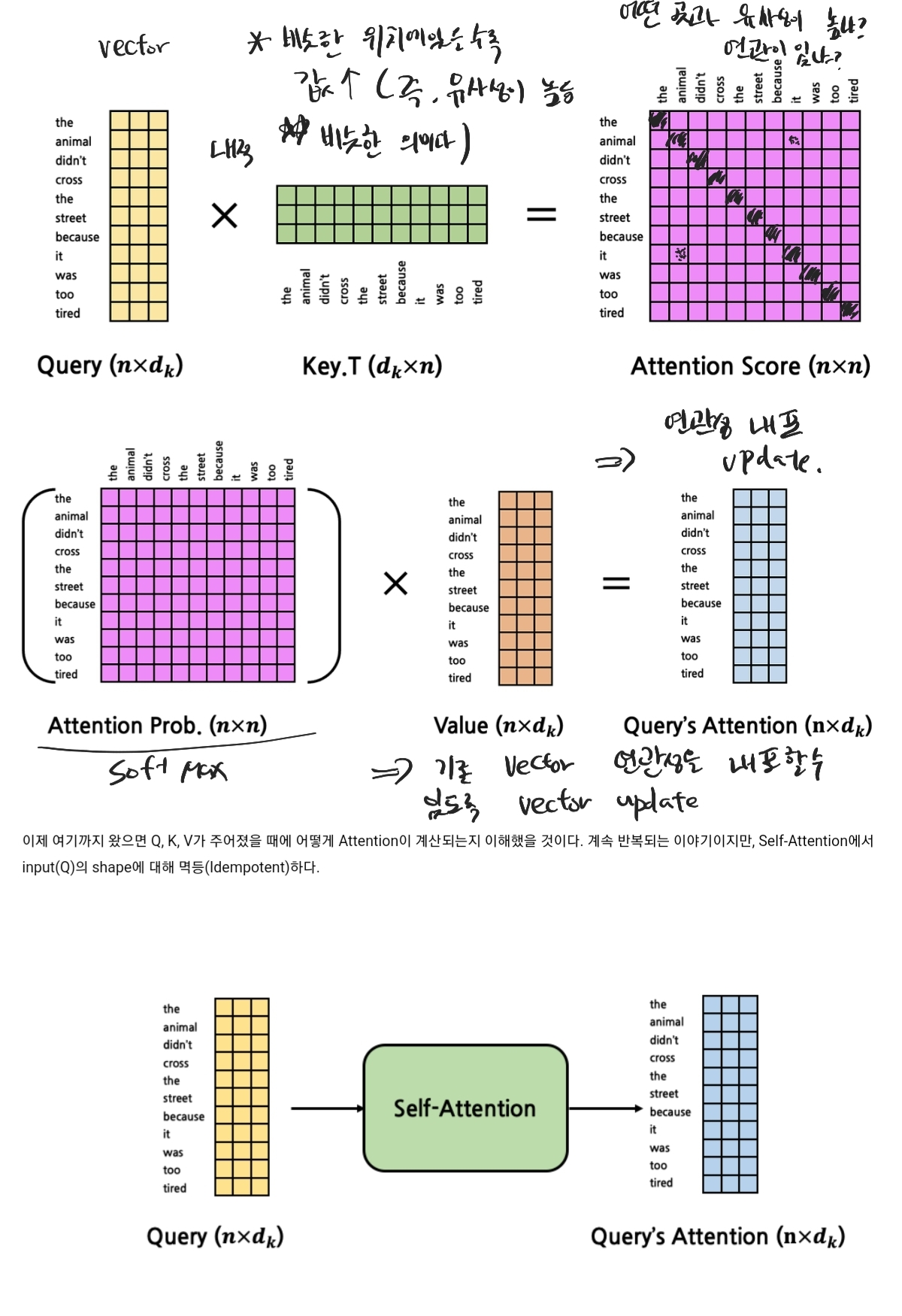 이렇게 구한 스코어를 바탕으로 V와 내적을 통해 해당 요소의 새로운 Vector를 업그레이드 하여 기존에는 없던 요소별 연관성을 반영하여 Vector로 표현하게 되는 것이다.