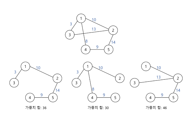 위처럼 노드,간선, 가중치가 제공되었을때 모든 노드를 연결하는 그래프를 그리는 방법은 아주 다양하게 그릴 수 있다.
