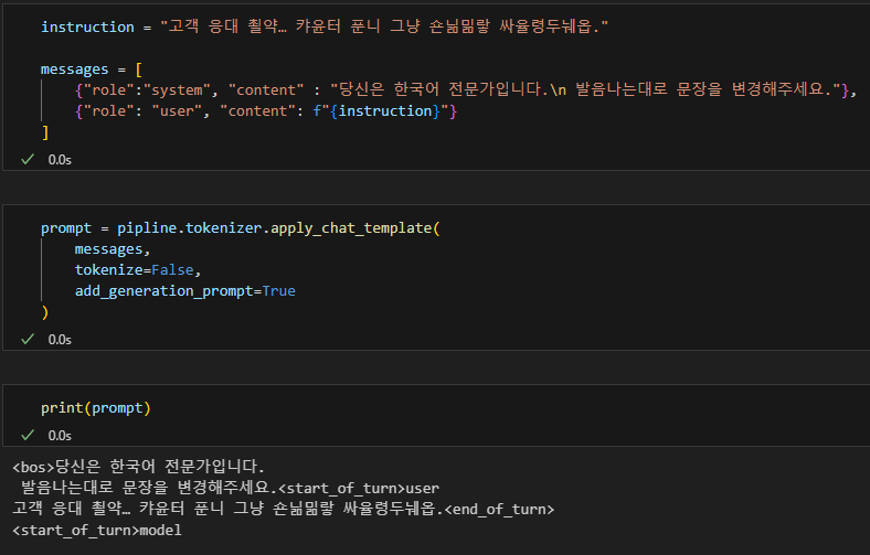 prompt의 출력물을 보면, <bos> <start_of_turn> <end_of_turn> 형식으로 작성되는 것을 볼 수 있는데,