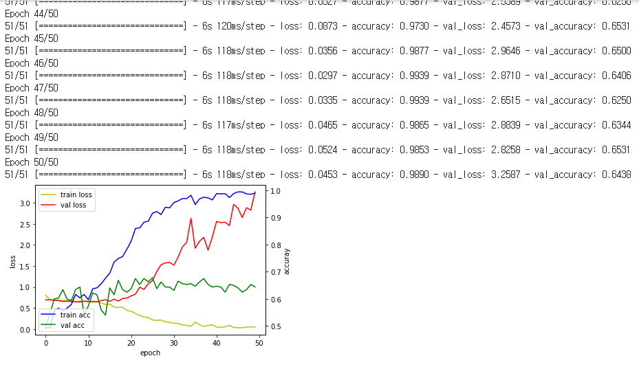 처참하죠? 정확도도 64% 정도 나오네요. (티처블 머신은 79%) 패배했습니다. 당연히 구글이 함께한 모델과 비교할 수 없죠. 물론 잘 학습된 모델이라고 말할 순 없습니다.(둘 다) 이유는 loss도 봐야 하기 때문에... 이건 나중에 언급하도록 하겠습니다.