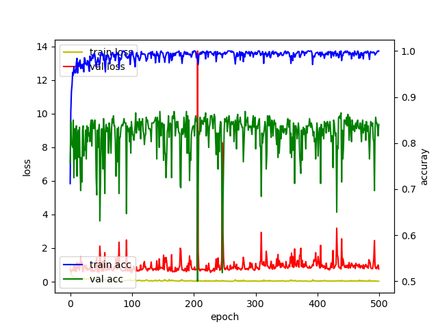 노란색 선이 train loss , 빨간색 선이 val loss .... 딱 봐도 노란색 선(train)은 어느 정도 [그림 1.]에서의 빨간색 선과 유사(?) 하다고 볼 수 있지만, 빨간색 선(validation)은 정말 이상적이지 않다. 필자는 epoch이 적어서 그런 줄 알고 500번으로 늘려봤다.