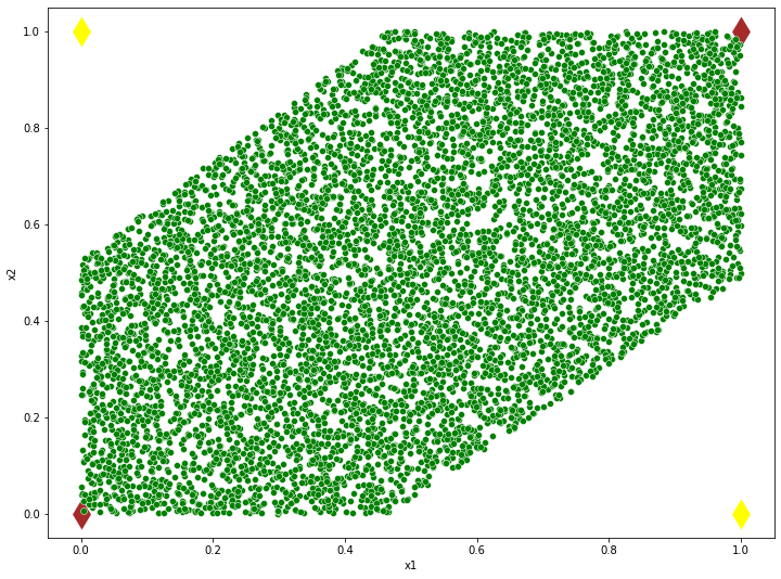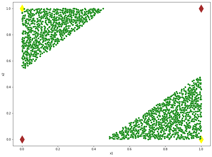 수많은 초록색의 점들은 x1,x2를 임의로 생성해 [그림 1-2]의 맨 오른쪽 초록색의 노드까지 거쳐 생성된 값 중