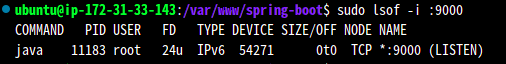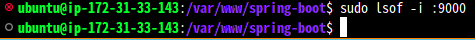 sudo lsof -i :{포트번호} ex) sudo lsof -i :9000