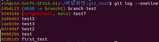 그러면 조금 특이한 log를 볼 수 있다. main 브랜치는 test7 까지만 되어있고, branch1 은 현재 commit한 내용까지 들어가 있는 것을 확인 할 수 있다.