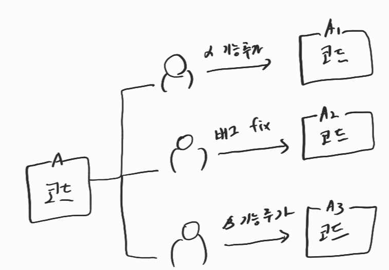 다수의 개발자들이 동일한 소스코드를 공유하고 다루게 되는 상황이 발생하는데, 같은 코드에서 버그수정/ 기능추가 등등...