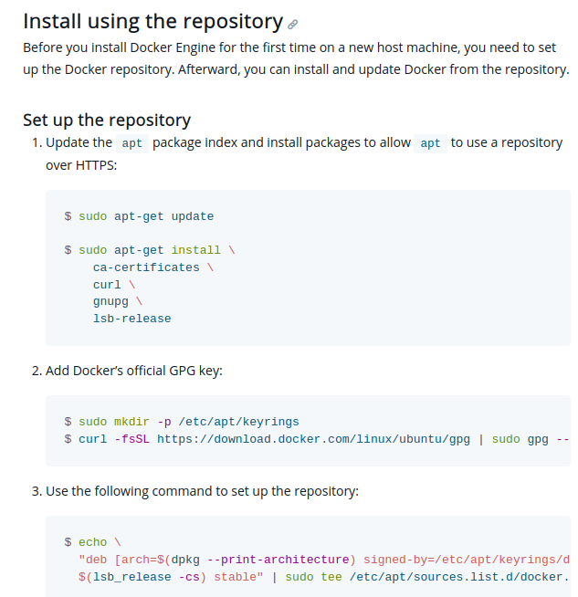 1. 도커 엔진을 먼저 설정해야 하므로 'Docker's pakage repository'에 먼저 들어가보자.