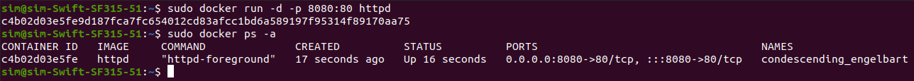 앞서 했던 것처럼 docker run -d -p 8080:80 httpd 를 통해 진행해보겠다(--name 옵션은 제외하였다)