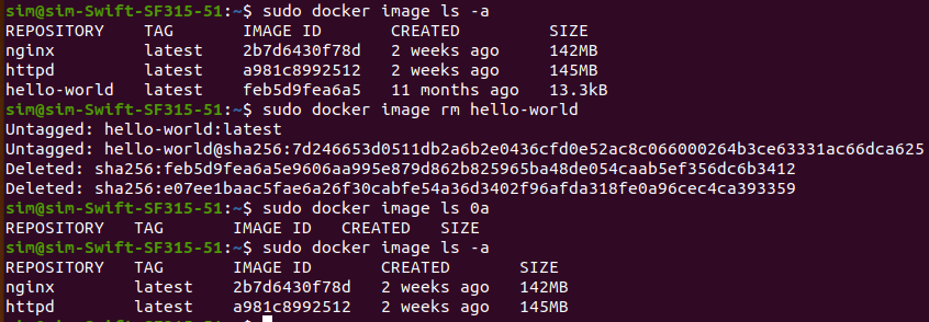 docker image rm hello-world 를 통해 간단히 진행 할 수 있다.