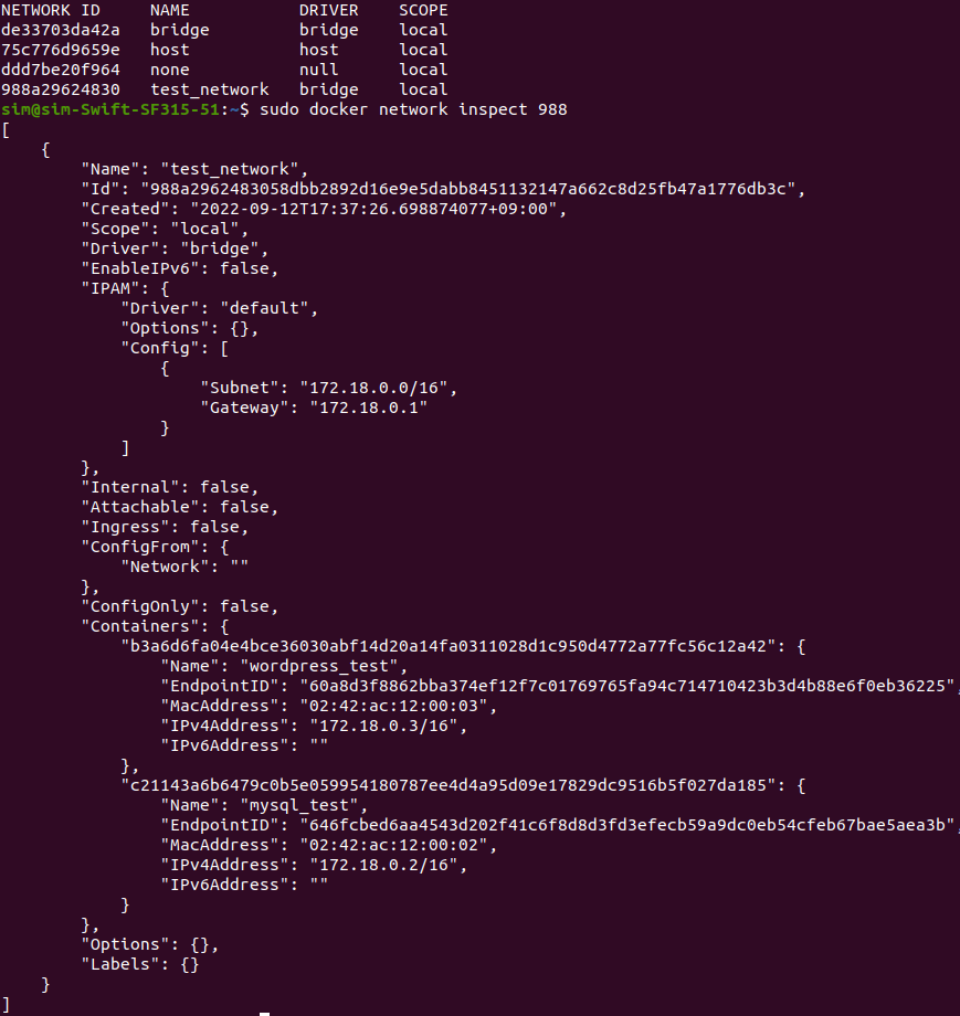 이처럼 기존 network 에 추가로 test_network가 생성 된 것을 볼 수 있었다.