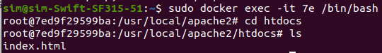 exec 명령어로 해당 컨테이너로 들어왔고, 마운트해준 htdocs폴더안에 index.html이 있는 것을 확인 할 수 있었는데,