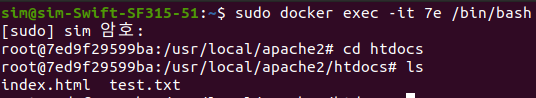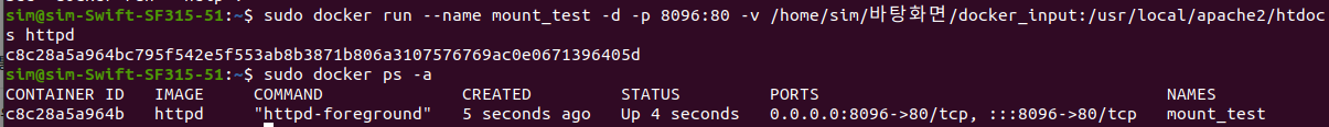 docker run --name mount_test -d -p 8096:80 -v /home/sim/바탕화면/docker_input:/usr/local/apache2/htdocs httpd