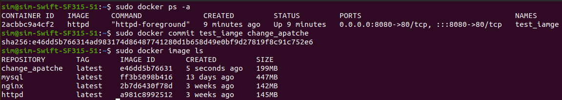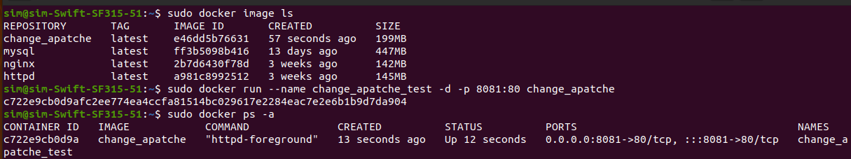 이처럼 commit 명령어를 통해 change_apatche 이미지가 생성 된 것을 볼 수 있다!
