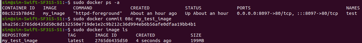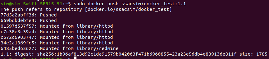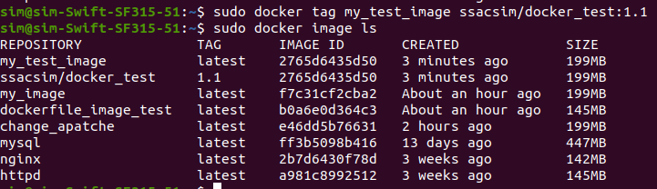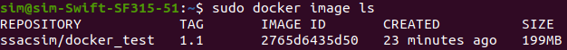 이렇게 해보면.. 중간에 ssacsim/docker_test 1.1 이미지가 생성된 것을 볼 수 있을것이다..! my_Test_image와 IMAGE ID을 비교해보면 똑같지만, REPOSITORY 와 TAG만 변경해서 새로운 이미지를 만들었다..