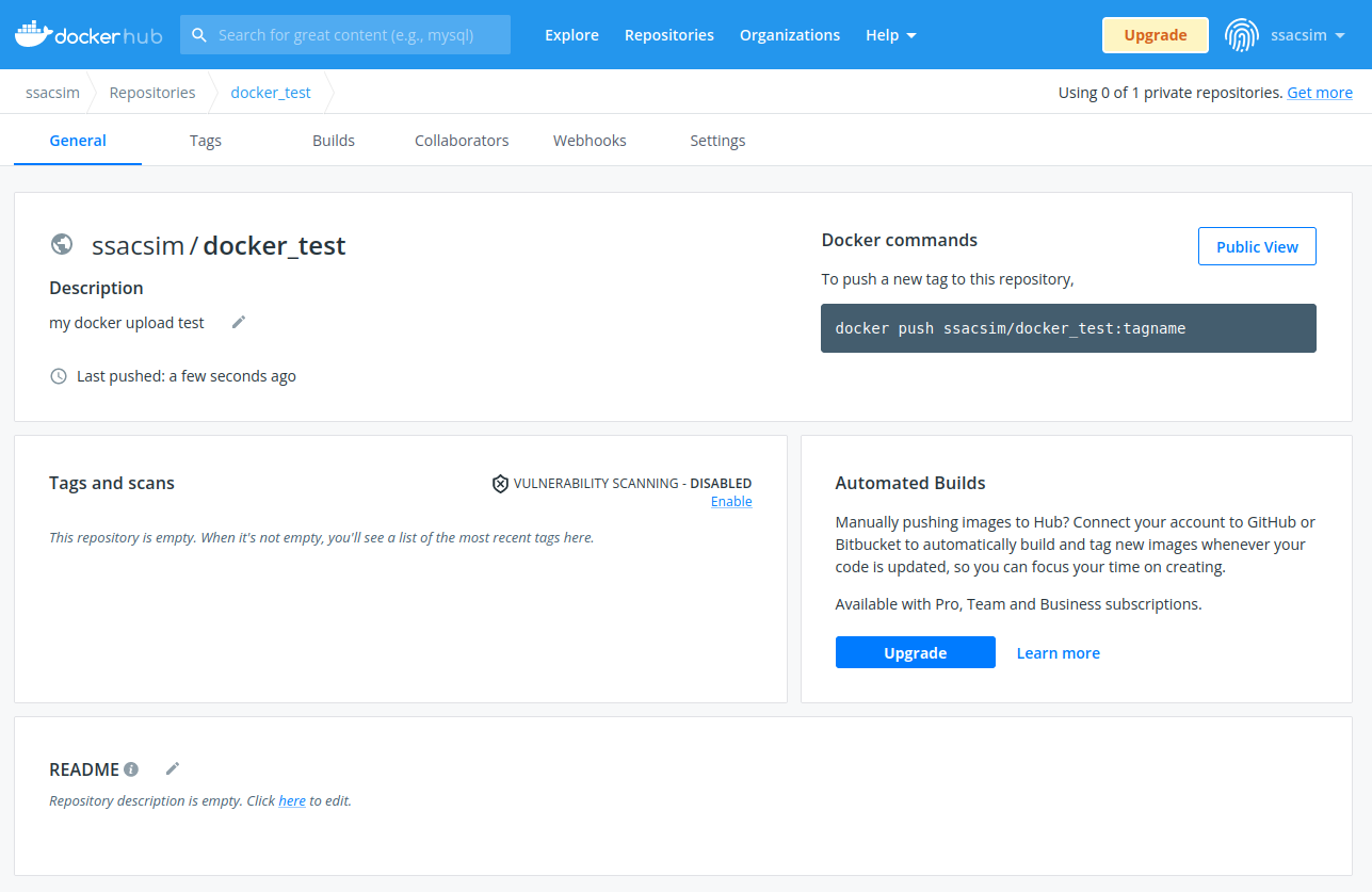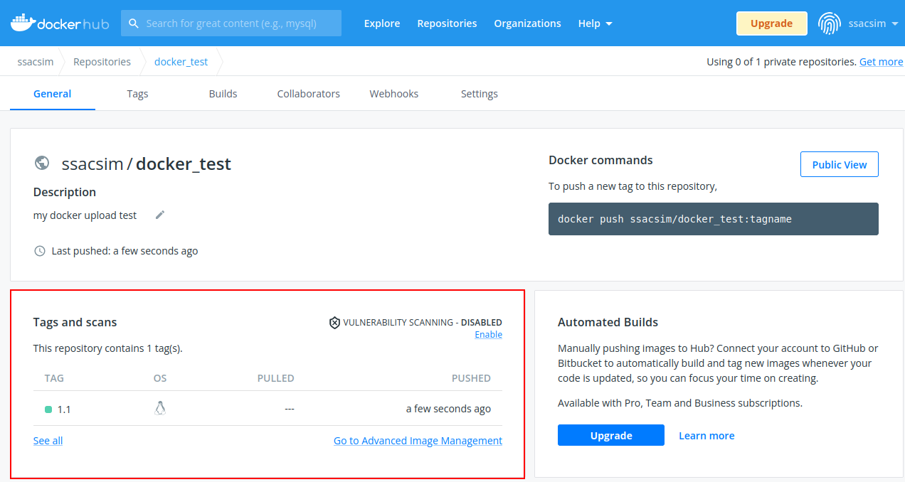 위처럼 push를 진행하였고, 이제 도커 허브사이트로 들어가 확인해보자.