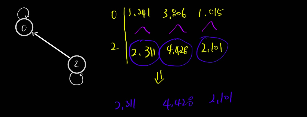 먼저 0노드부터 설명을 해보자면, 전체 그래프에서, 0노드는 시작점이 0노드 / 2노드의 종착점이라는 사실을 알 수 있다.(즉, 방향성이 존재하기 때문에)