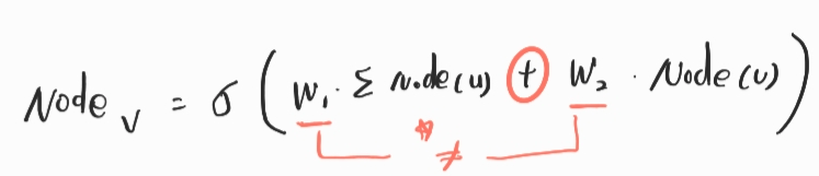 1. 노드 v와 노드 u에 곱해지는 W가 서로 다르다는 점