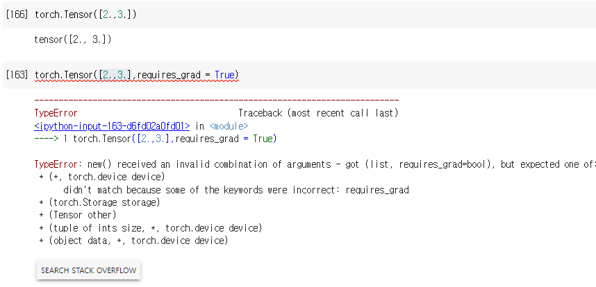 이처럼, requires_grad를 사용했을때 오류가 발생하는 것을 볼 수 있다.