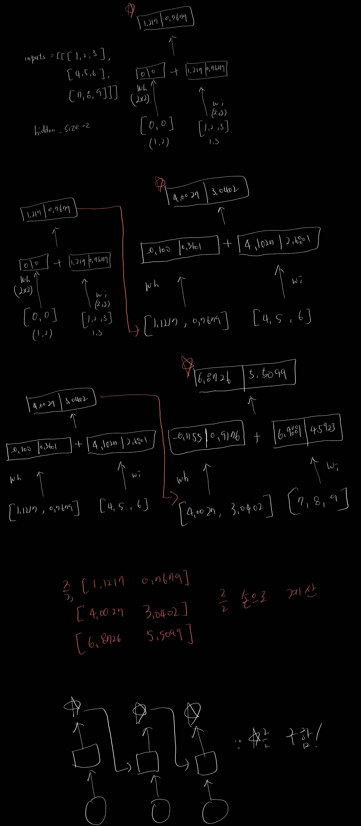 **참고로 코드의 결과가 왜 2가지가 나오냐면,, torch의 RNN은 return을 2가지 한다. 첫번째는 각 output을 모아놓은 것이고,