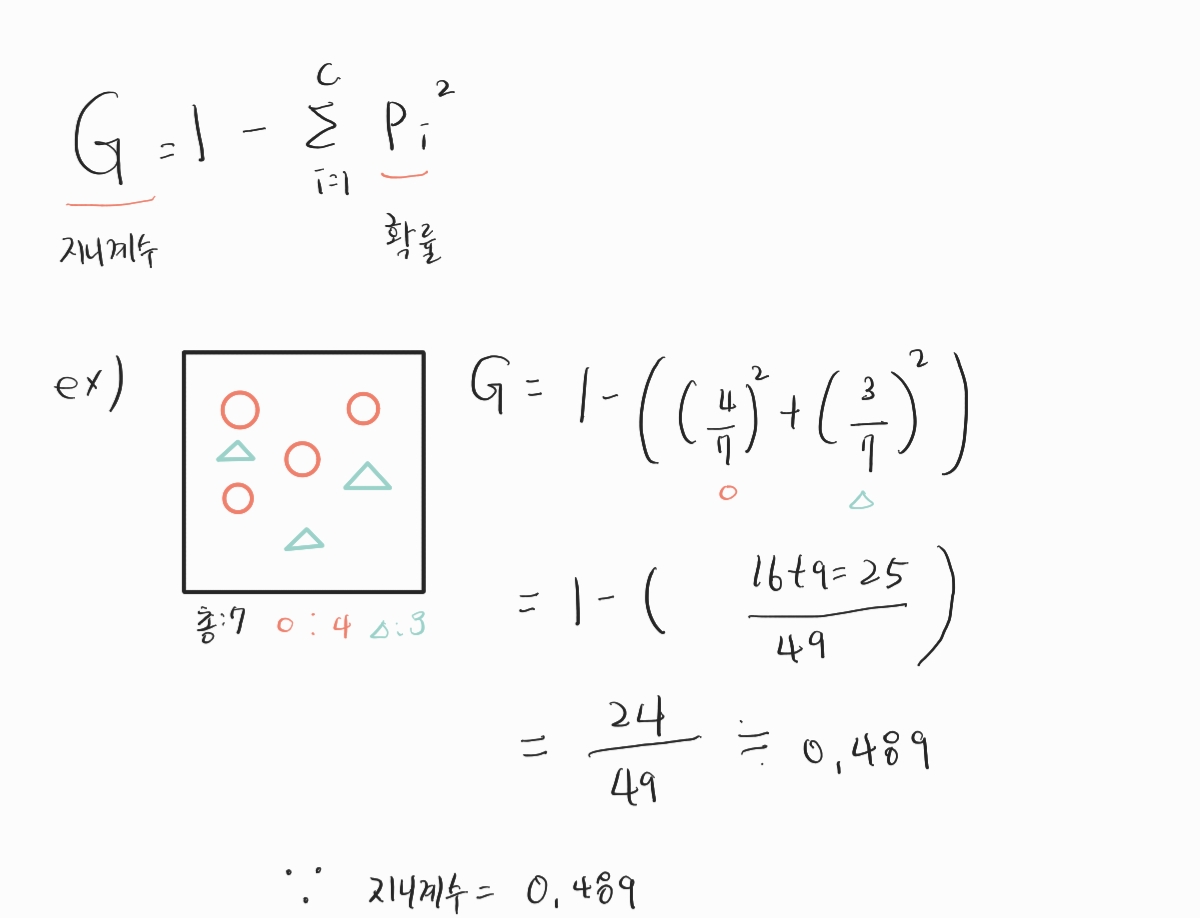 해당 dataset에서 각 클래스별로 나올 확률의 제곱를 더하여 1을 빼주면 지니계수가 된다.