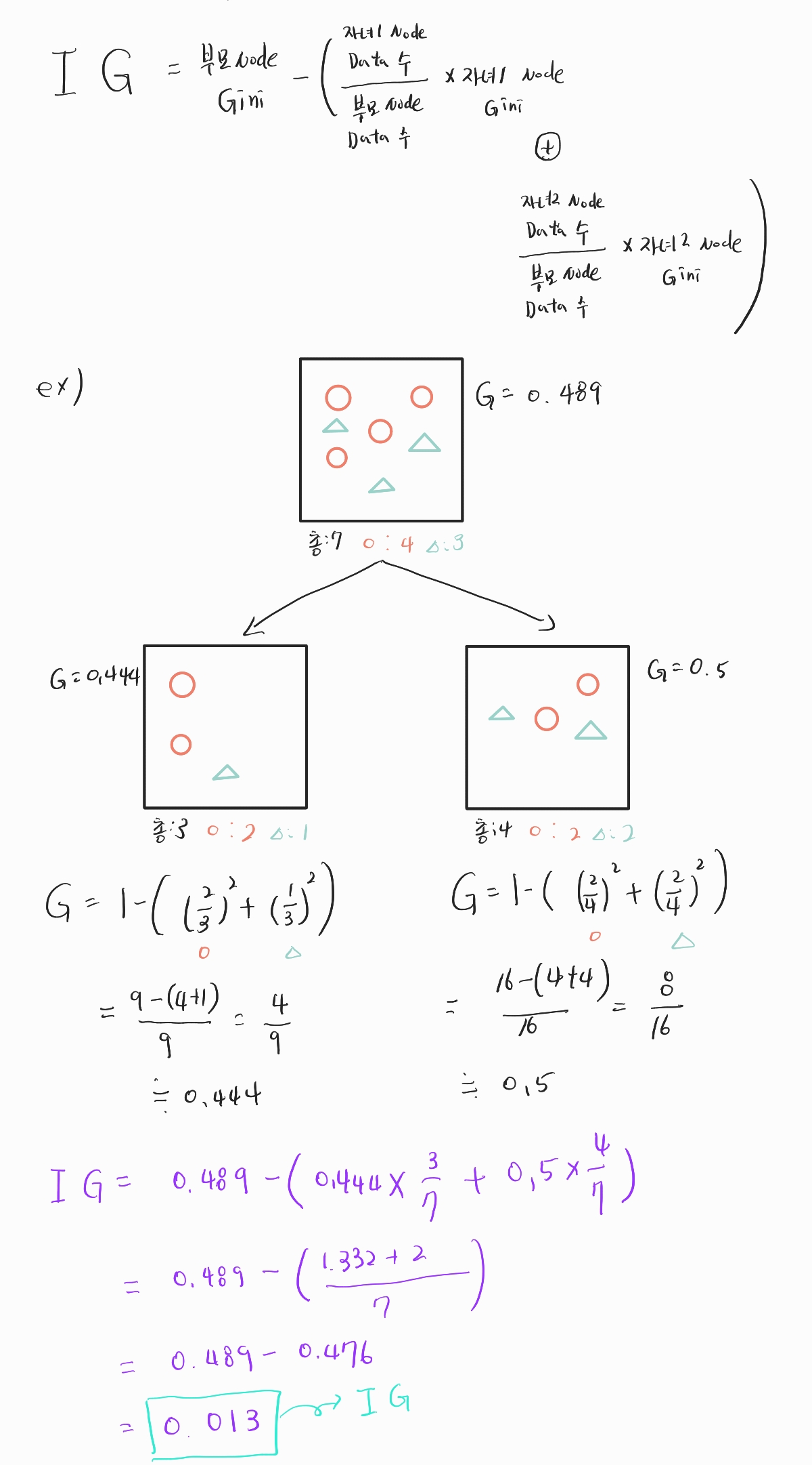 위 예제를 보면, IG를 구하는 방식을 알 수 있을것이다. 즉, 물려받은 데이터의 비율대로 Gini계수와 곱해 더한 후