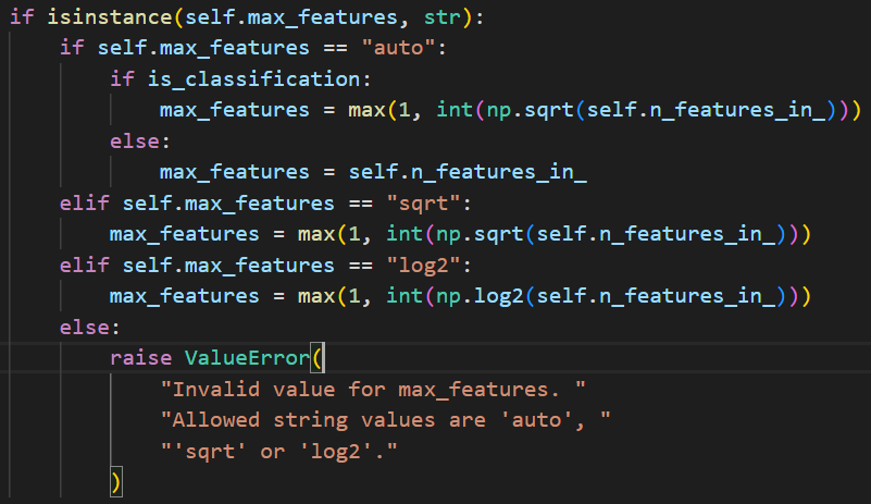 위 코드처럼 classification일때는 sqrt를 취해 1개의 DT에서 split을 할때 몇개의 feature를 고려하여 best 부분에서 split을 진행한다. ( N개의 feature에서 가장 best split 구간을 찾고, 그 split 구간을 사용)