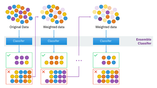 Boosting은 판별기가 잘못 판별한 sample의 weight(가중치)를 바꾼 후, 다음 판별기에 input으로 넣어 이전에 맞추지 못했던 데이터를 보다 잘 맞출 수 있는 판별기를 만드는 것이다.
