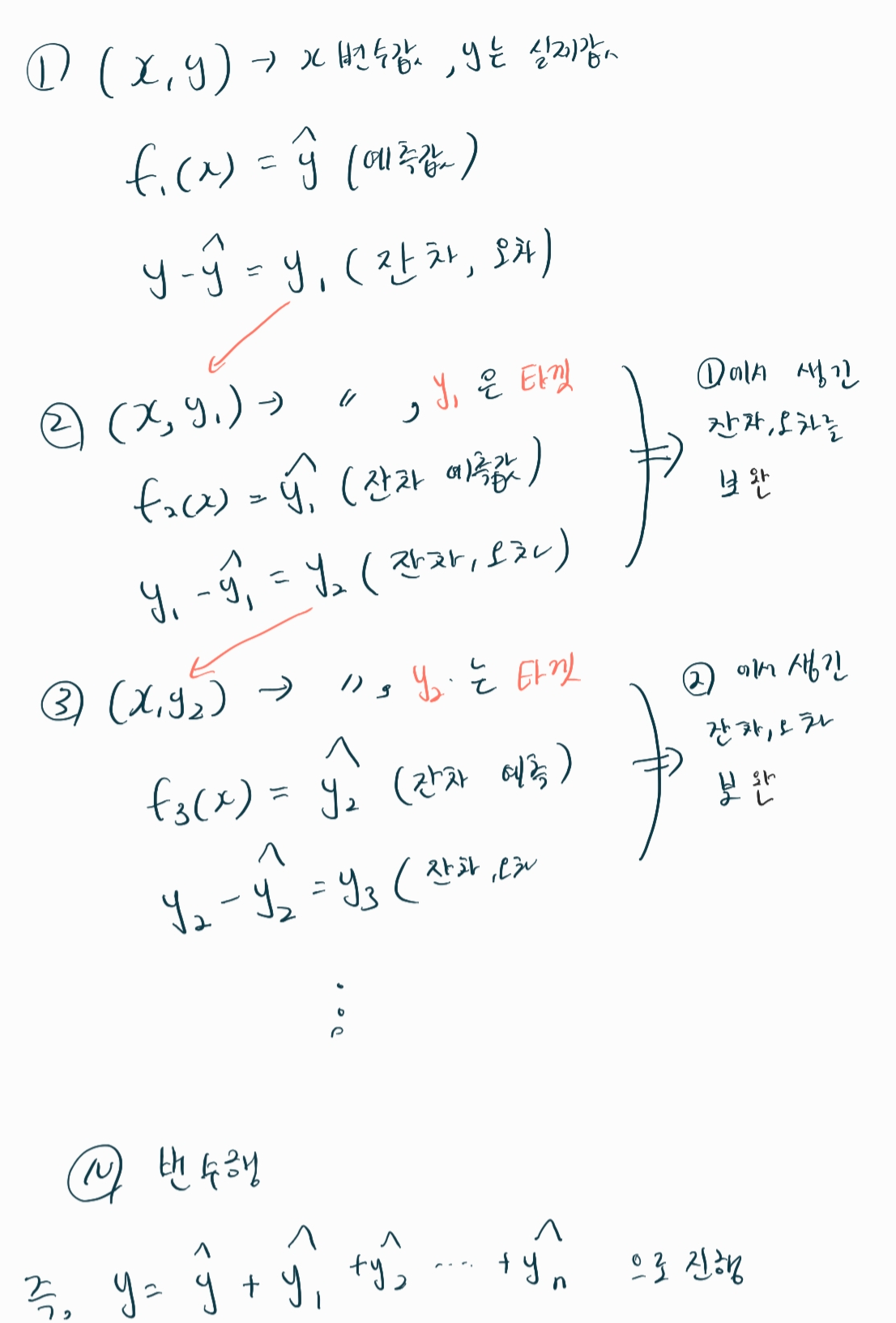 GBM은 '잔차'를 학습하여 원래 y값에 최대한 비슷하게 다가가는 기법이다.