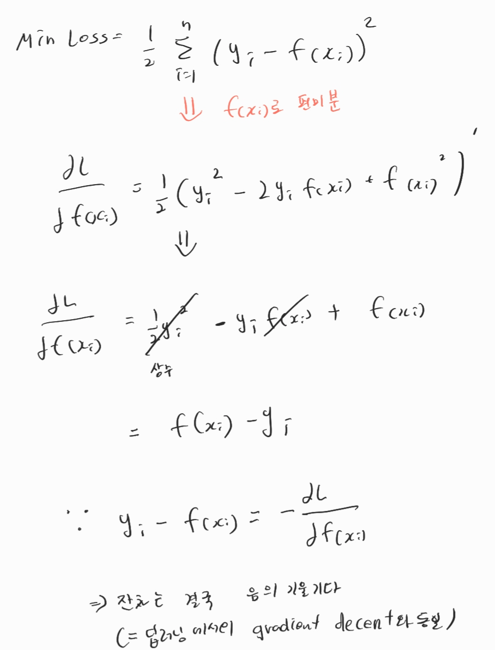 위 수식처럼, 편미분을 해보면 딥러닝에서 사용하는 gradient descent 알고리즘과 유사한 방식으로 분류기들이 점차 y값에 다가갈 수 있도록 해준다는 것이다. ( 딥러닝에서는 Wegiht값의 영향력을 구하기 위해 W로 편미분)
