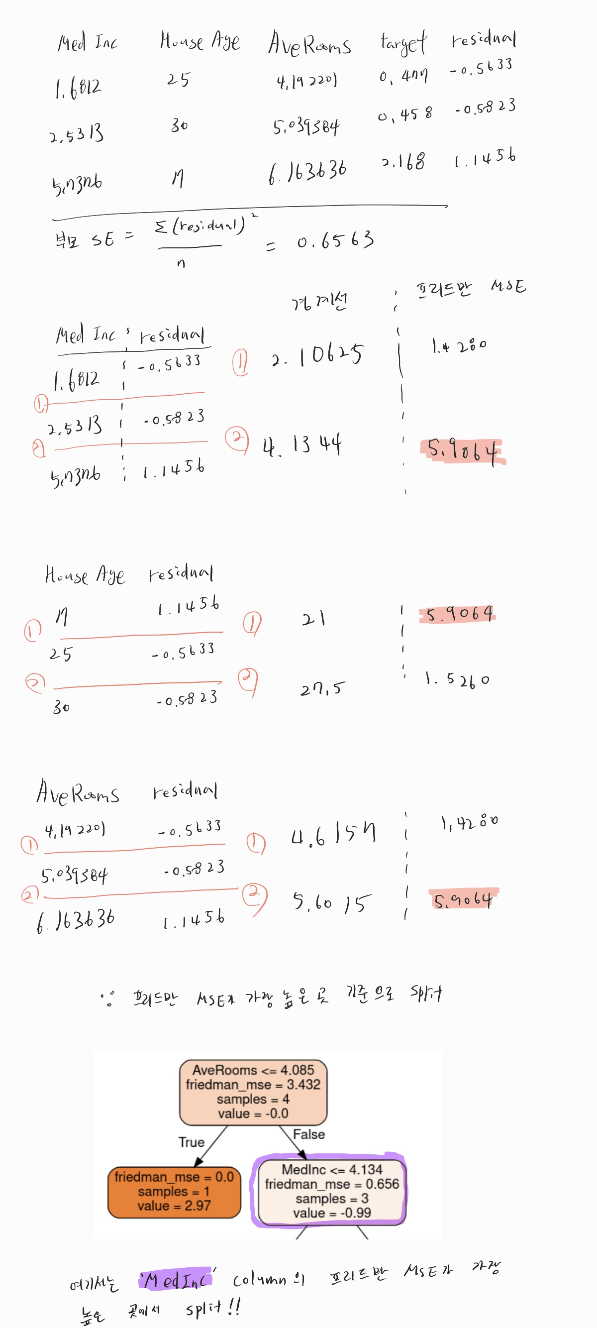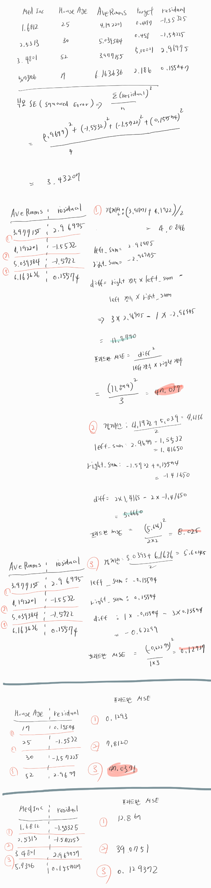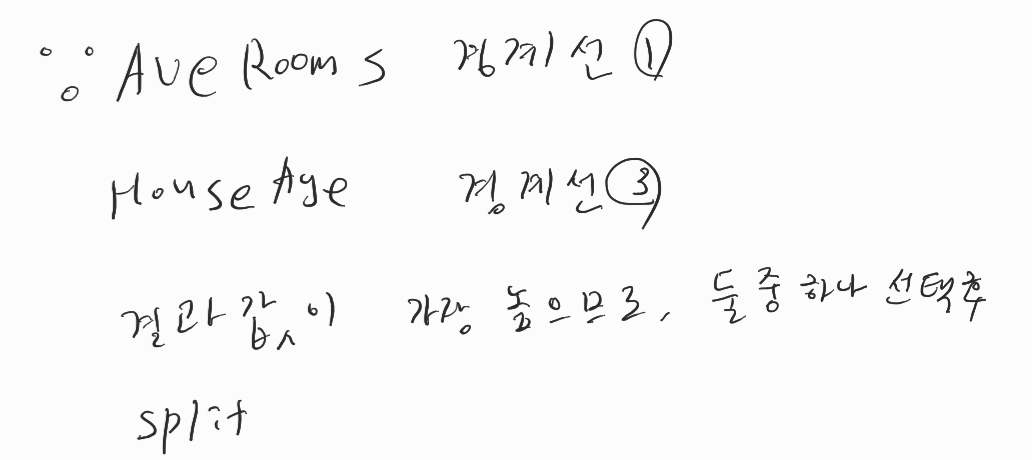위 같은 과정을 통해 Split 구간이 AveRooms or HouseAge 라는 사실을 알게 된다.